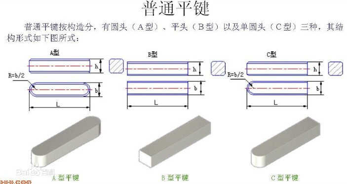 平鍵,是依靠兩個側面作為工作面,靠鍵與鍵槽側面的擠壓來傳遞轉矩的鍵。平鍵分為普通型平鍵、薄型平鍵、導向型平鍵三種。普通型平鍵對中性好,定位精度高,折裝方便,但無法實現軸上零件的軸向固定,用于高速或承受沖擊、變載荷的軸;薄型平鍵用于薄壁結構和傳遞轉矩較小的地方;導向型平鍵用螺釘把鍵固定在軸上,用于軸上的零件沿軸移動量不大的場合。